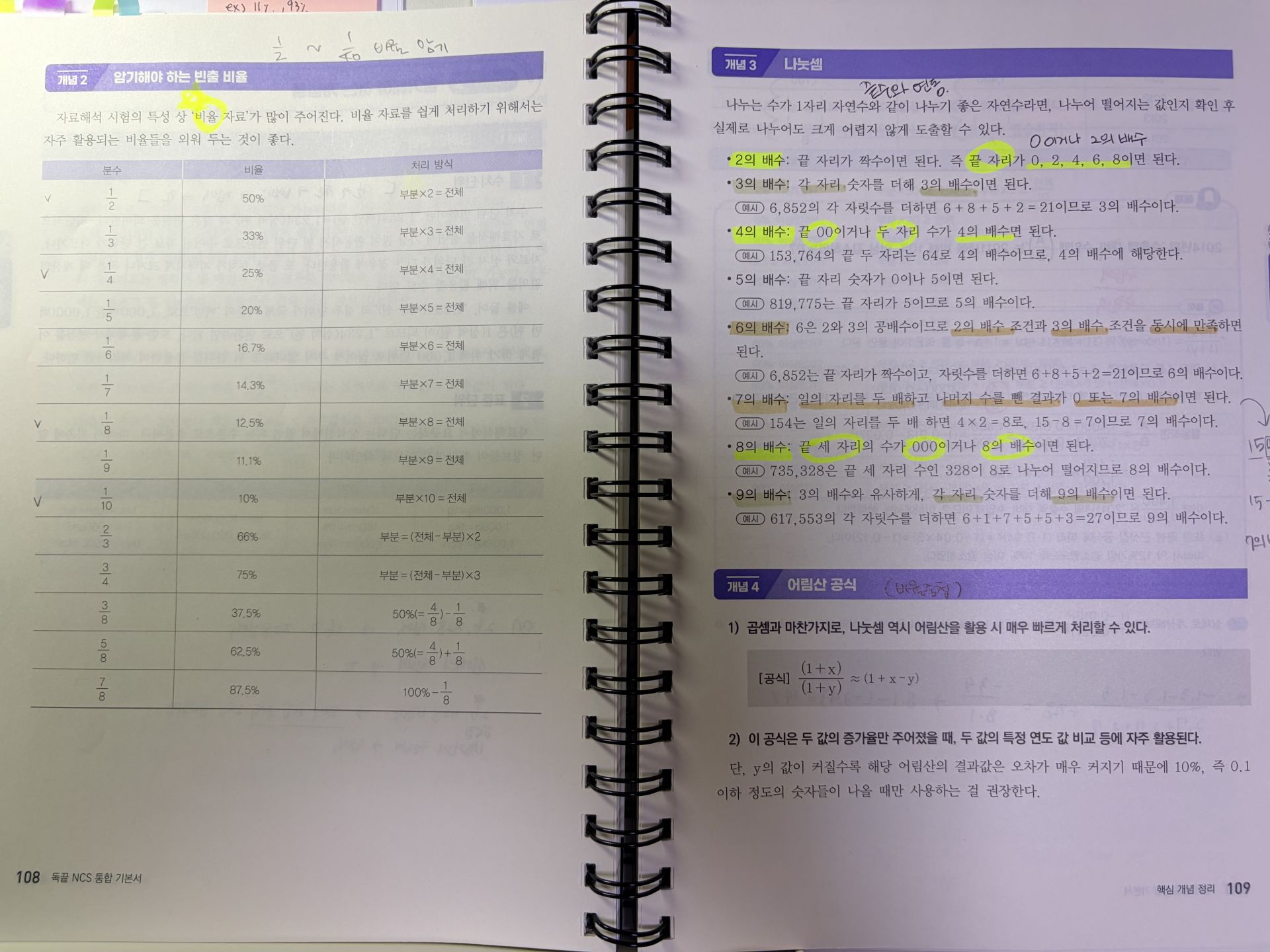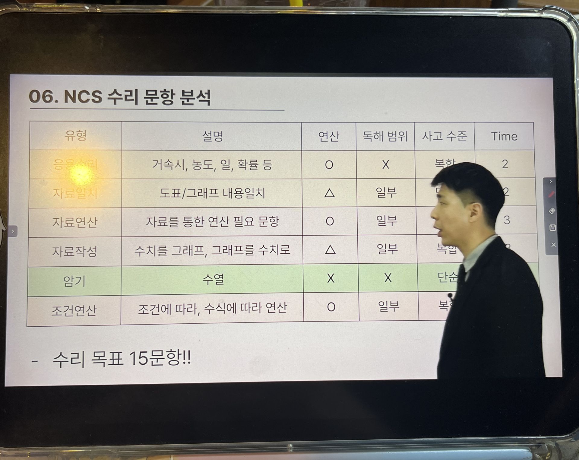 또, 기초 NCS부터 응용수리 파트까지 연결해서 설명해주셔서 좋았습니다. 저는 응용수리에서 특히 약했던 증감률, 거속시, 원가 및 이익금, 일 수 계산, 소금물 농도 유형을 빠르게 푸는 스킬을 배웠는데, 단순 공식 암기보다 “왜 이 방식이 더 빠른지”를 기준으로 풀이 흐름을 정리해주는 점이 도움이 됐습니다. 예를 들어 증감률은 불필요한 계산을 줄이는 변환 방식이 있었고, 거속시는 문제 조건을 정리하는 순서만 바꿔도 시간이 확 줄어드는 게 느껴졌어요.