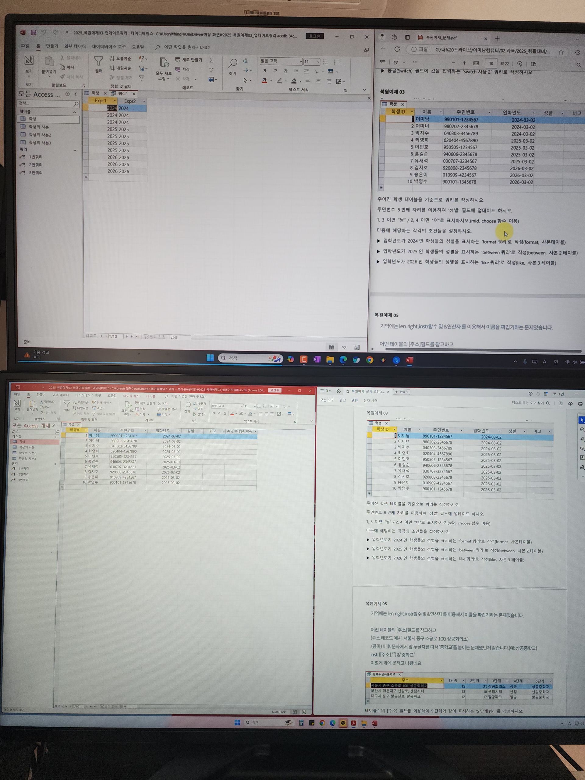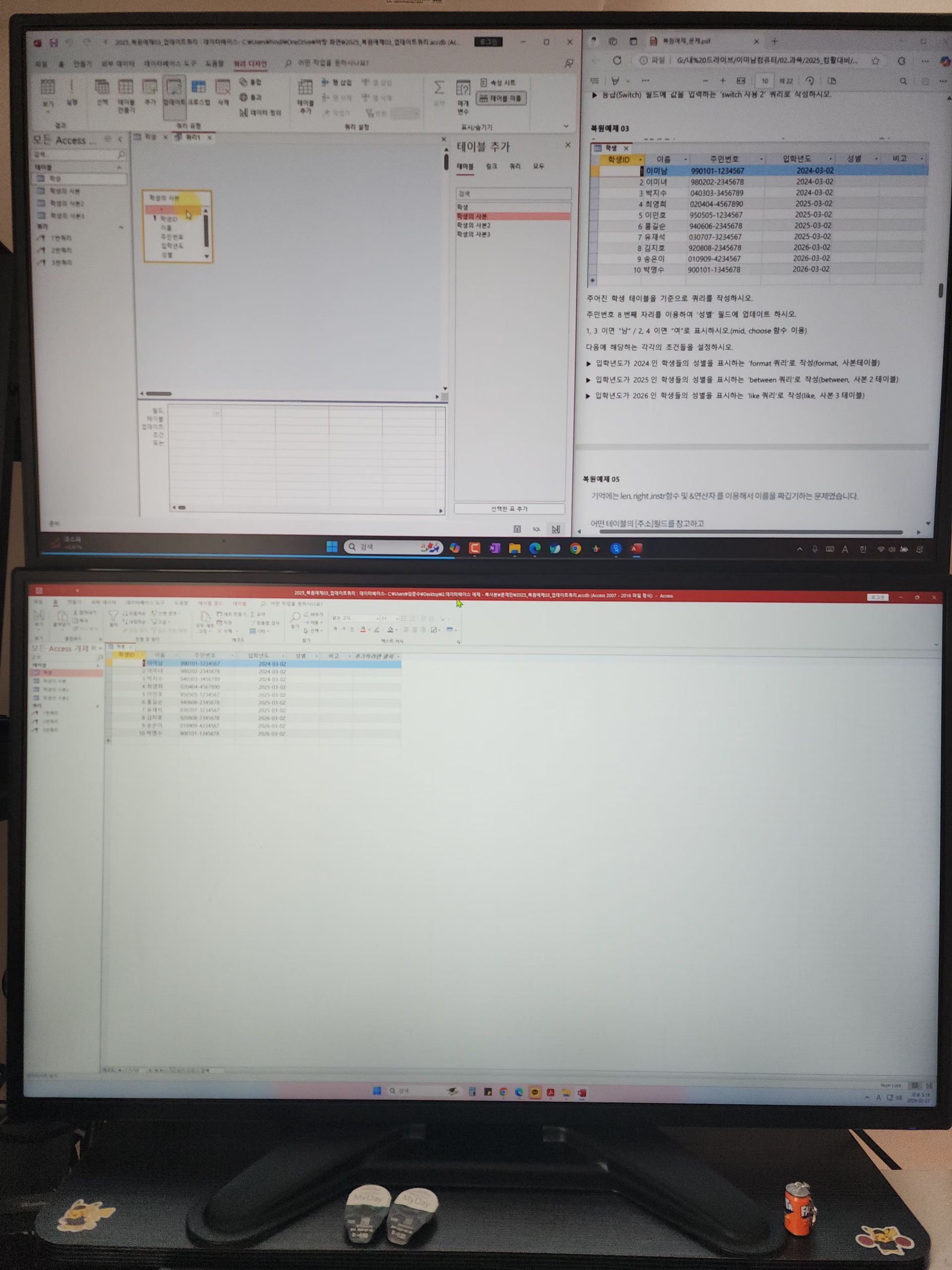 또한 교재는 최신 기출복원 문제 위주로 구성되어 실제 시험 화면과 거의 동일한 형식이라 실전 감각을 키우는 데 큰 도움이 되었습니다. 매크로와 VBA 부분도 코드 한 줄 한 줄 의미를 설명해 주셔서 처음 접하는 사람도 부담 없이 따라갈 수 있었습니다. 액세스는 쿼리, 폼, 보고서 작성 과정을 반복 실습하도록 구성되어 있어 자연스럽게 손에 익었습니다.