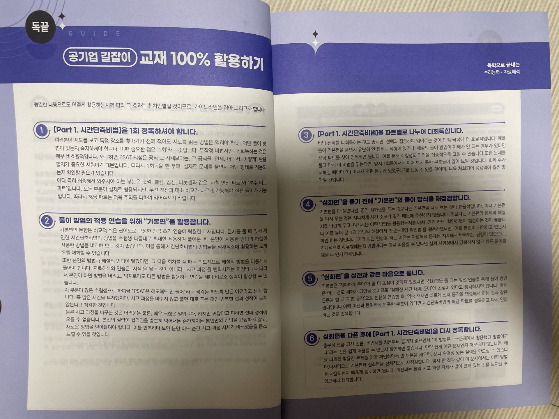 교재 구성도 실전 대비에 좋았습니다. 유형별로 포인트가 명확해서 복습할 때 “내가 어디서 막히는지” 체크가 쉽고, 강의 듣고 바로 교재로 반복하면 풀이 속도가 조금씩 올라가는 게 체감됩니다. 아직은 어렵게 느껴지는 부분도 있지만, 이번 주에 배운 유형들은 오답노트로 패턴 정리 → 같은 유형 2~3회 반복 → 시간 재면서 재풀이 방식으로 꾸준히 늘려갈 계획입니다.
