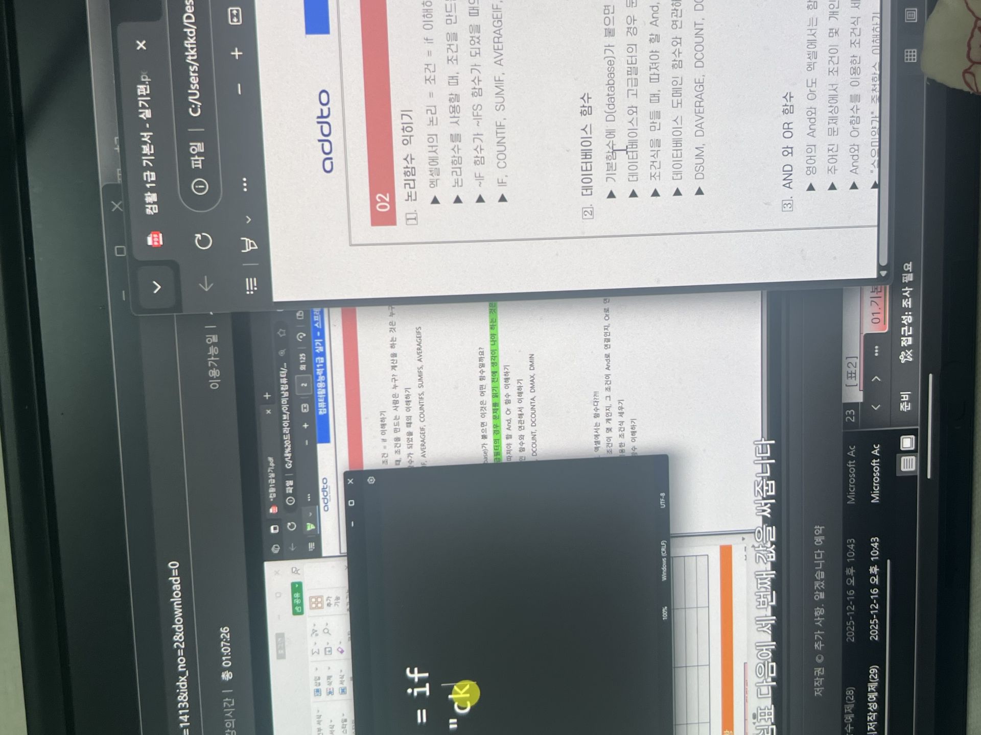 그래서인지 필기를 합격하고 독학으로 실기 준비하다보니 함수라는 거대한 벽에 막혀 미루고 미뤄 필기 합격 유예기간 15일 남기고 부랴부랴 "애드투 이미남 강사님의 컴활 2급 실기" 강의를 듣게 되었어요. (포기하기엔 필기 합격이 너무 아깝잖아요...ㅠ)
