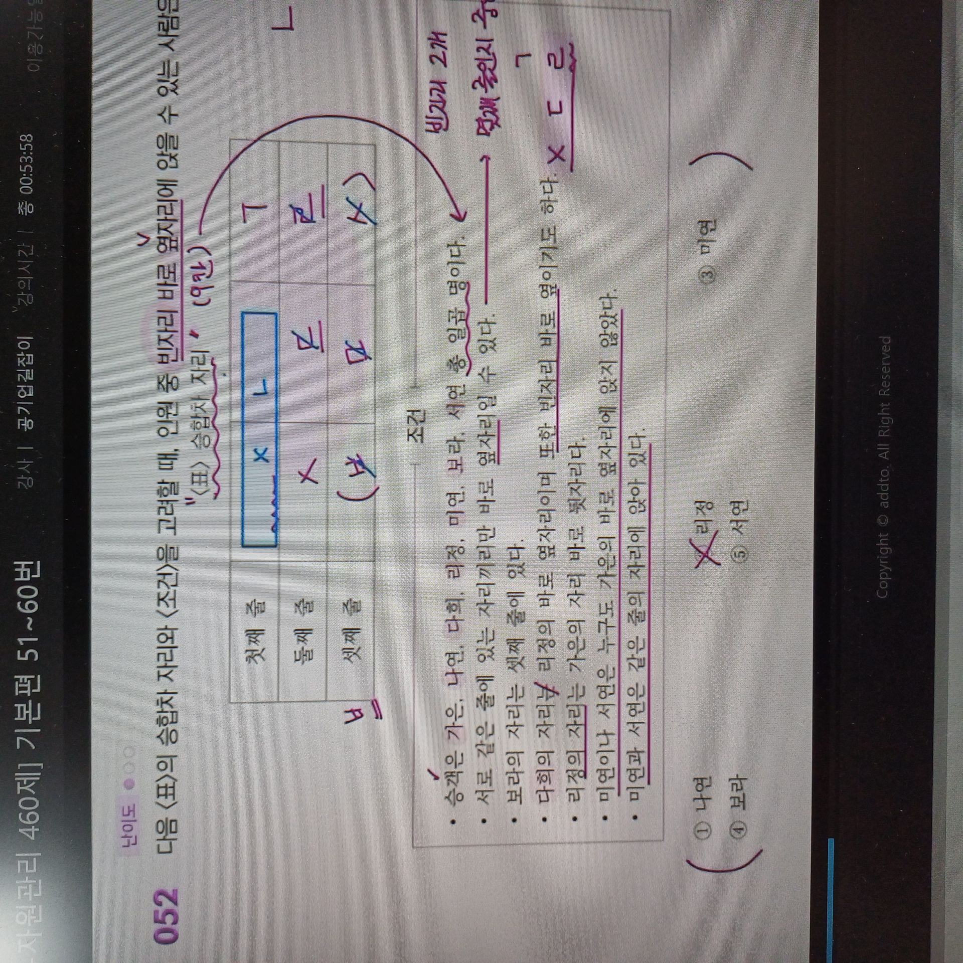 강의는 단순히 문제 풀이를 반복하는 방식이 아니라 자주 출제되는 유형을 중심으로 최적의 풀이 순서와 사고 흐름을 정립해 주는 실전형 커리큘럼으로 구성되어 있었습니다. 무작정 모든 선지를 다 따져보려던 기존의 나쁜 습관을 버리고, 필요한 조건부터 걸러서 적용하는 '읽는 순서'의 기술을 전수해 주어 풀이를 한결 깔끔하게 만들어 주었습니다. 또한 다양한 풀이 팁과 정답 판별 기준은 손이 멈추는 시간을 획기적으로 줄여주었습니다. 특히 경로 문제나 추론 유형을 다룬 심화 강의는 복잡한 구조를 유형화하여 무작정 계산이나 답 찾기 시도부터 하던 저의 나쁜 습관을 완전히 고쳐놓았습니다.