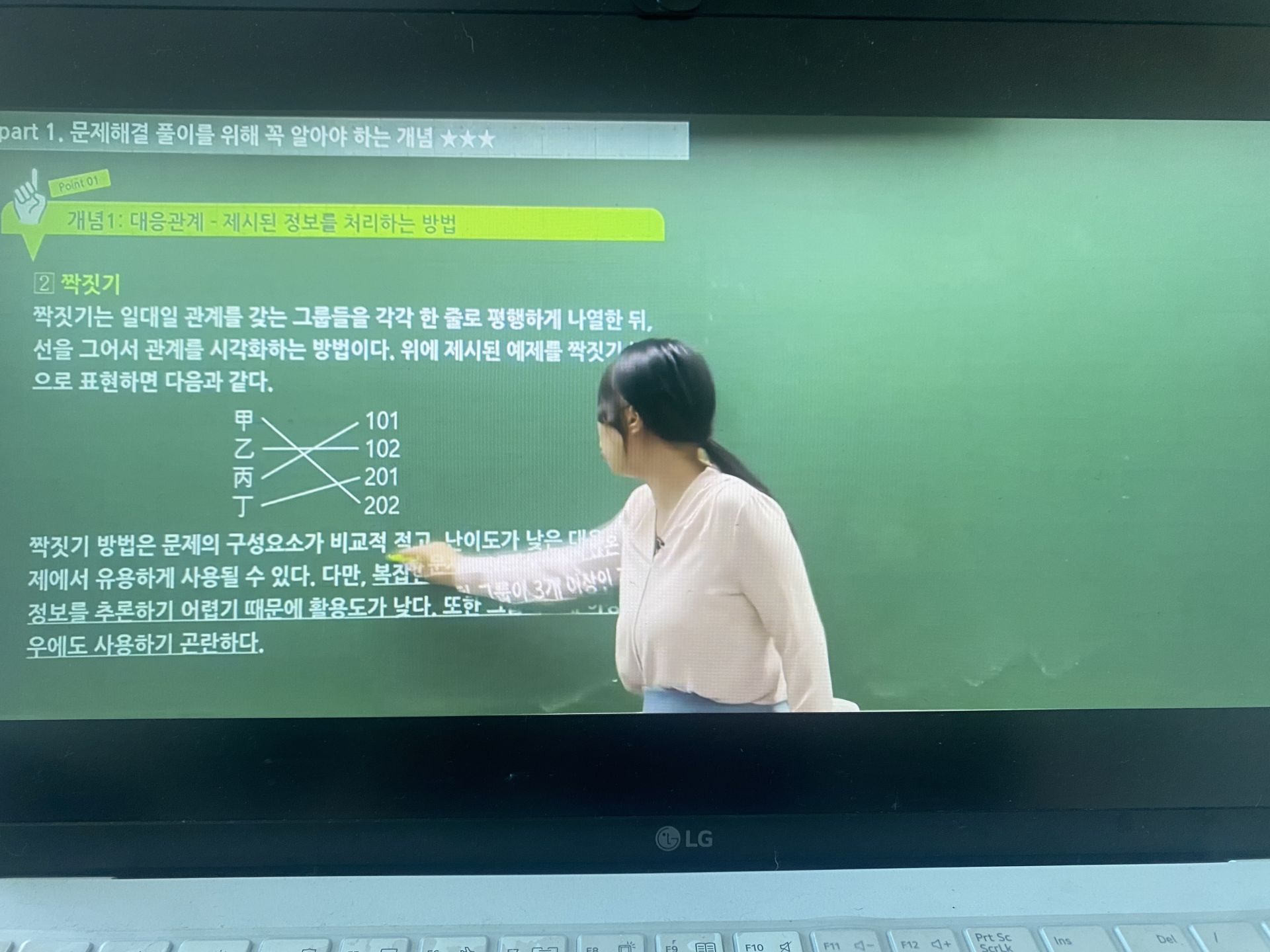 강의는 단순히 문제 풀이를 반복하는 방식이 아니라 자주 출제되는 유형을 중심으로 최적의 풀이 순서와 사고 흐름을 정립해 주는 실전형 커리큘럼으로 구성되어 있었습니다. 무작정 모든 선지를 다 따져보려던 기존의 나쁜 습관을 버리고, 필요한 조건부터 걸러서 적용하는 '읽는 순서'의 기술을 전수해 주어 풀이를 한결 깔끔하게 만들어 주었습니다. 또한 다양한 풀이 팁과 정답 판별 기준은 손이 멈추는 시간을 획기적으로 줄여주었습니다. 특히 경로 문제나 추론 유형을 다룬 심화 강의는 복잡한 구조를 유형화하여 무작정 계산이나 답 찾기 시도부터 하던 저의 나쁜 습관을 완전히 고쳐놓았습니다.