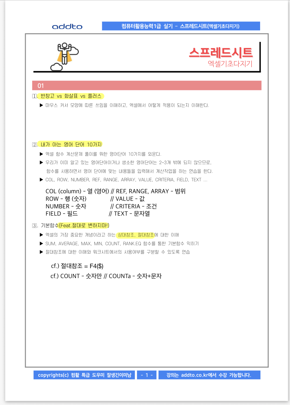 전 엑셀 정말 아무것도 몰라서 수강하기 전까지는 걱정이 한가득이었는데 강의 들을 수 있는 기간도 넉넉하고 정지할 수있고, 온라인 교재 파일도 무료 배포해서 부담없이 공부를 시작할 수 있었어요~!