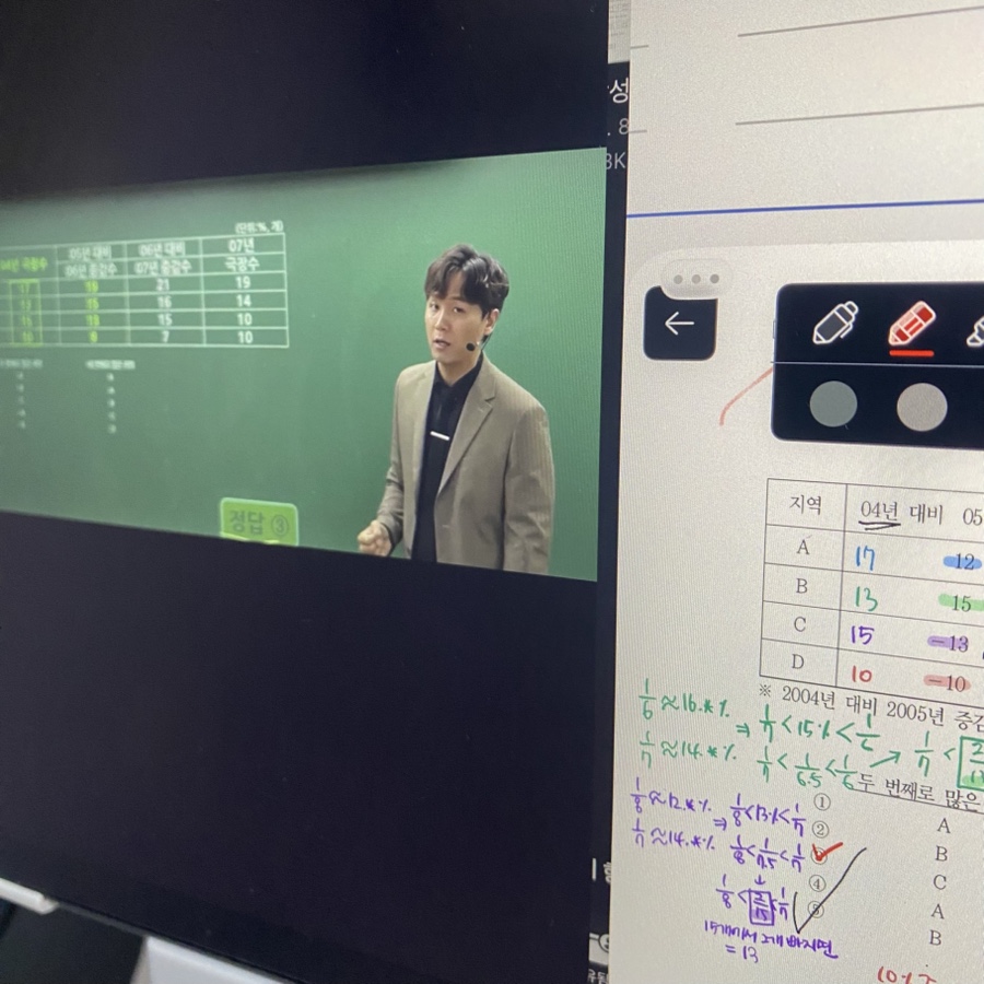 2주 차에는 자료해석과 응용 수리 과목을 집중적으로 공부하게 되었는데요, 두 가지 모두 박수웅 선생님 강의다 보니 이번 주는 내적 친밀감이 생기더라구요! 진짜로 이해하기 쉽게 설명해 주시고 사소한 팁 같은 것도 잘 알려주셔서 개인적으로 너무 저한테 맞는 강의였고 굉장히 만족스러웠습니다.