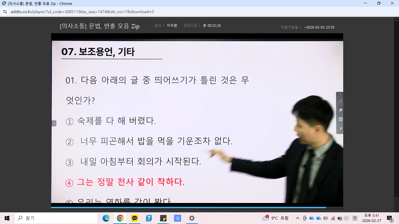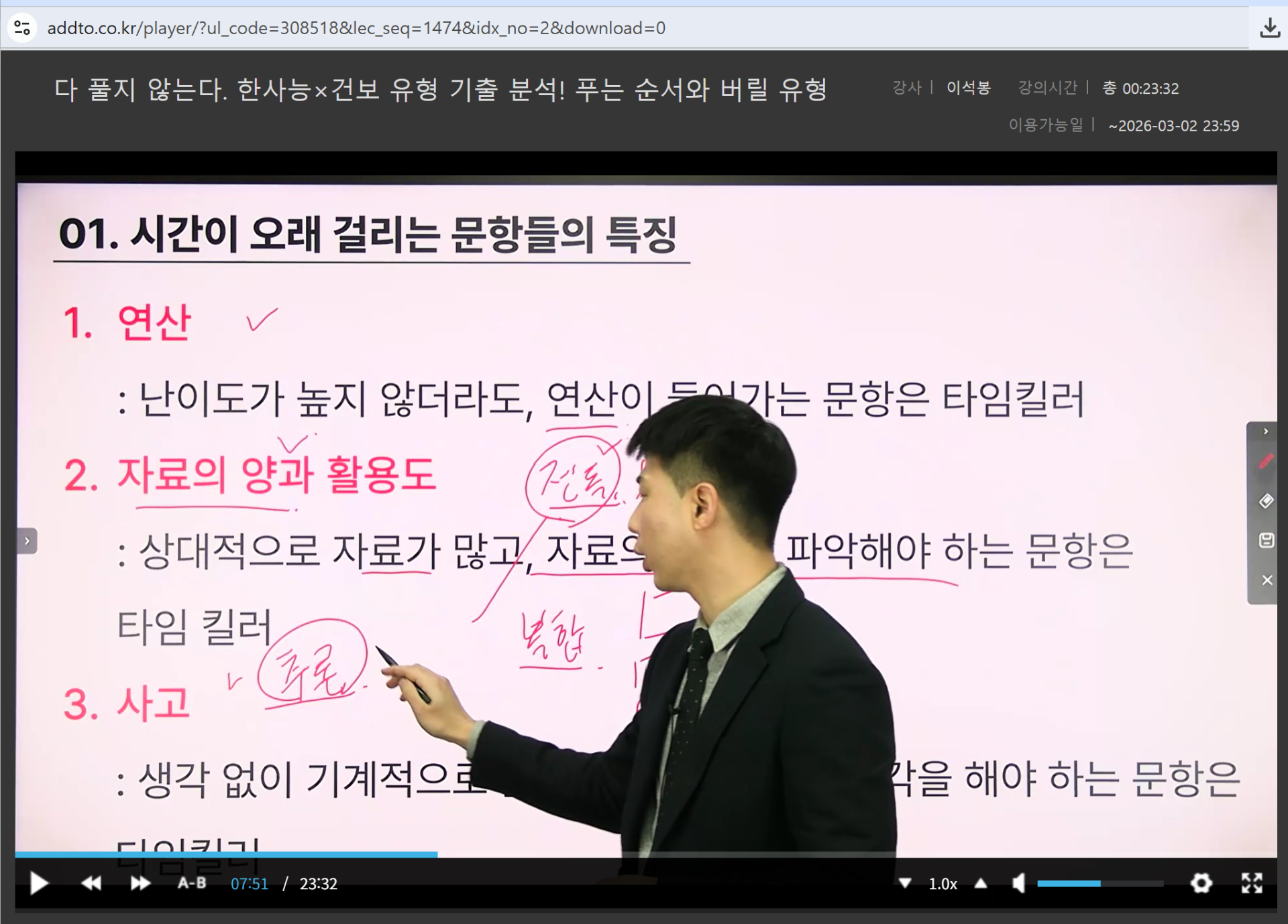 교재 또한 인강 내용과 잘 연계되어 있어 복습하기에 매우 좋았습니다. 유형별로 정리가 되어 있어 강의를 들은 뒤 바로 해당 유형 문제를 풀어볼 수 있었고, 풀이 과정을 다시 확인하며 스스로 부족한 부분을 점검하기에 적합했습니다. 저는 강의를 수강한 후 교재 문제를 풀면서, 강의에서 강조한 포인트를 체크하고 풀이 시간을 함께 기록하는 방식으로 공부하고 있습니다. 이를 통해 불필요하게 시간이 오래 걸리는 지점을 스스로 확인할 수 있었습니다.