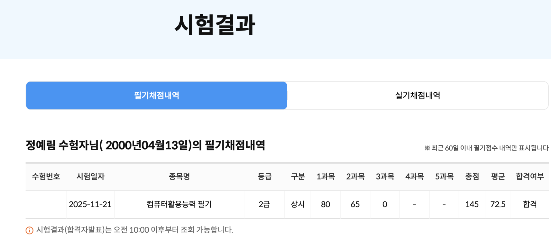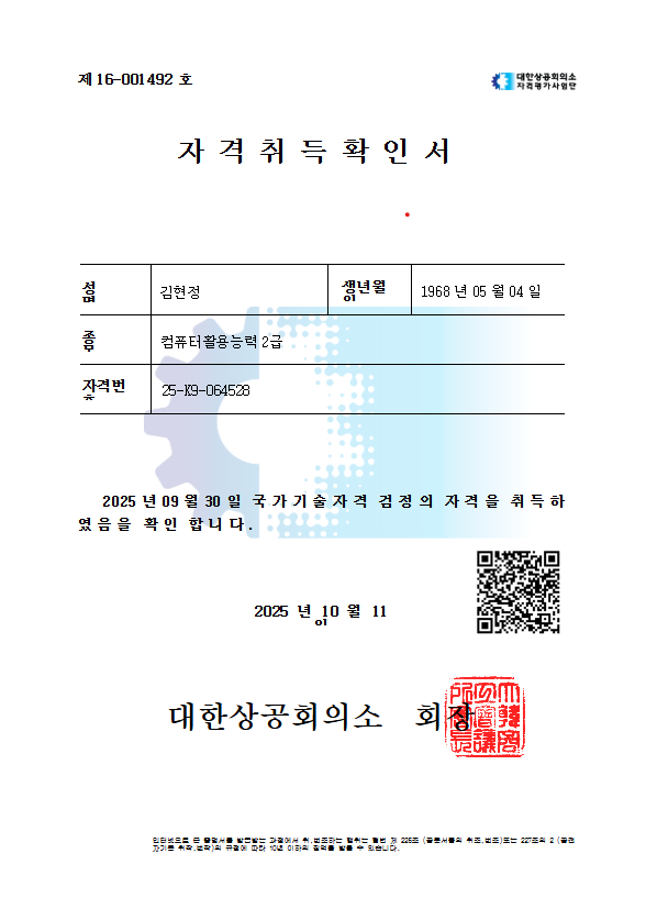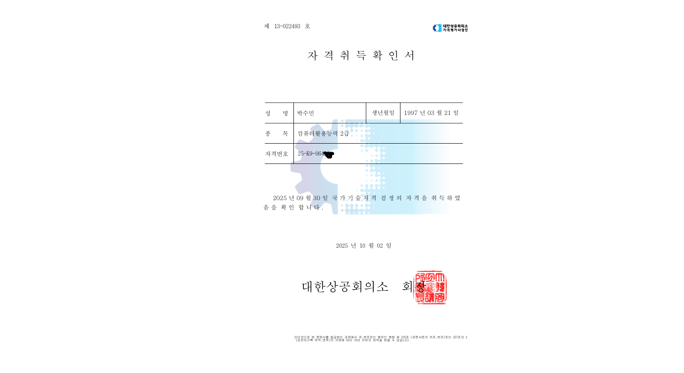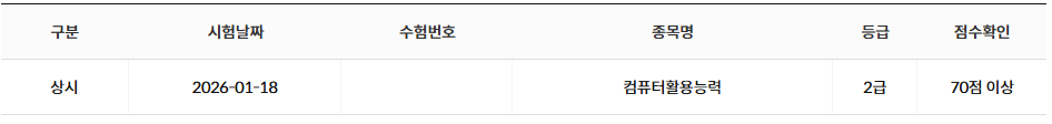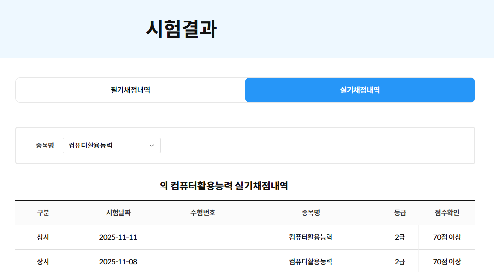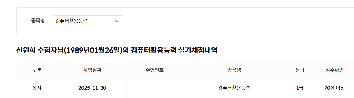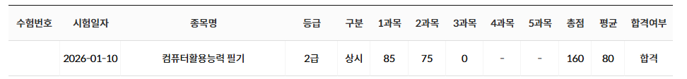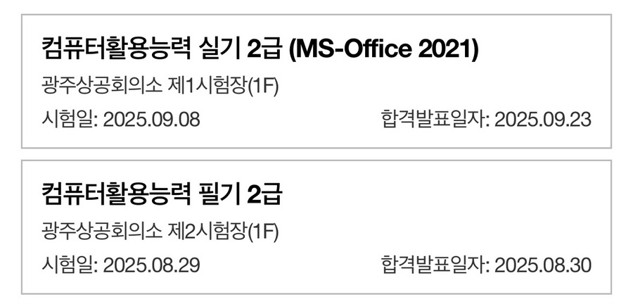저는 컴퓨터활용능력 2급에 응시하였고, 필기와 실기 모두 1회 응시로 합격하였으며 전체 준비 기간은 약 3주 정도였습니다.